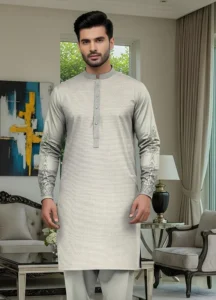 Traditional Pakistani menswear is known for its elegance, comfort, and timeless style. This men’s silver cotton embroidered unstitched suit is designed for those who want a refined traditional outfit while staying comfortable during the summer season.